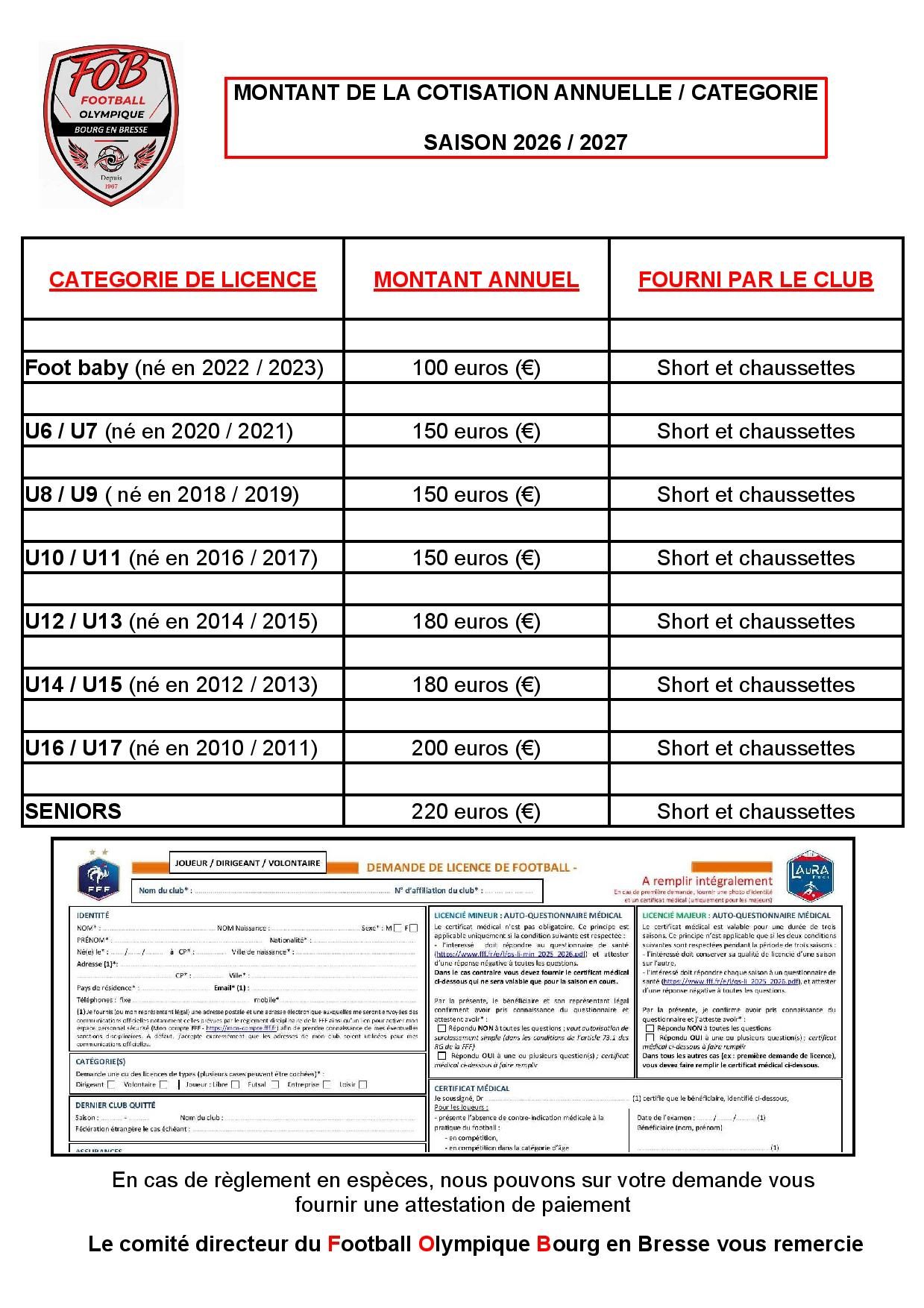 Veuillez trouver ci contre le montant demandé pour la cotisation annuelle de la saison 2026/2027 (pour chaque catégorie)